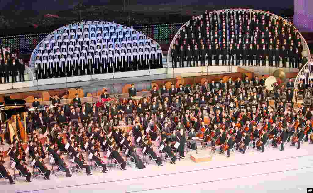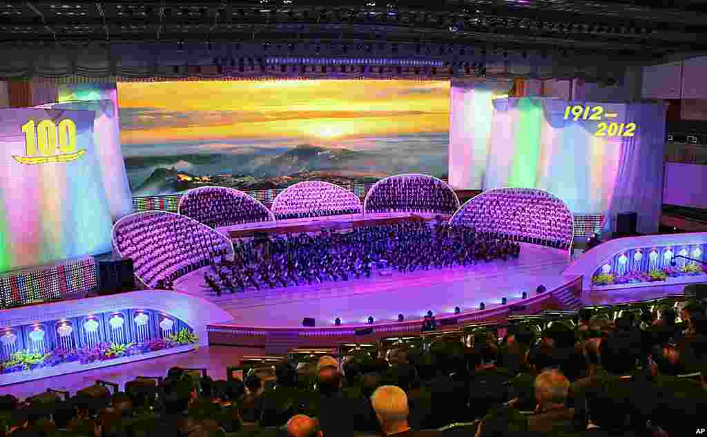 김일성 주석의 100회 생일인 지난 달 15일 평양의 대동강변에서는 불꽃놀이 행사가 진행됐습니다. 주체사상탑을 중심으로 불꽃이 연방 터지고, 그 아래 대동강 한 가운데에서는 색색깔의 물줄기가 공중으로 뿜어져 나왔습니다. 김정은 국방위원회 제1위원장도 태양절 불꽃놀이에 참석했고 평양 시민들도 밤 늦게까지 대동강변에서 행사를 지켜봤습니다. 밤 10시가 넘어 행사가 끝난 뒤 인근 거리는 귀가하는 평양 시민들로 인산인해를 이뤘습니다. 다음 날인 16일 평양체육관에서는 태양절을 기념하는 대공연이 있었습니다. 북한의 교향악단과 합창단 등이 김일성 주석과 김정일 위원장, 김정은 제1위원장을 찬양하는 음악을 연주하는 가운데, 무대 상단에 설치된 대형 스크린을 통해 세 지도자의 현지지도 모습을 담은 기록영화가 계속해서 상영됐습니다. 이날 공연은 김일성 주석의 100회 생일을 축하하는 형식을 갖췄지만 결국 김정은 시대의 개막을 선포하는 내용으로 마무리됐습니다. 취재에 백성원 기자입니다.