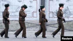 북한의 위협으로 한반도 긴장이 고조된 가운데, 11일 북한 신의주에서 보위대원으로 보이는 여성들이 압록강변을 순찰하고 있다. 방한복에 총기를 휴대했지만, 굽이 높은 하이힐을 신은 모습이 이색적이다. 사진은 압록강 건너 중국 단둥에서 촬영했다. VOA 뉴스